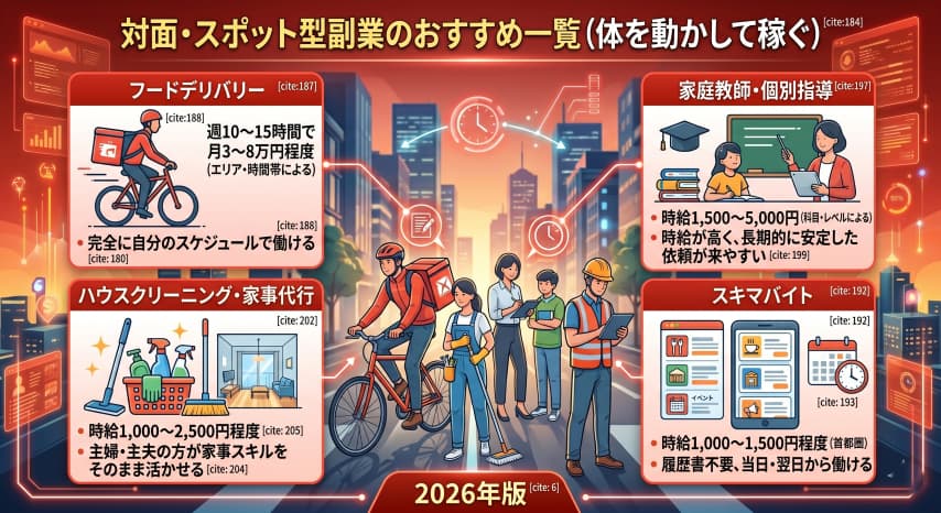 | 対面・スポット型 | 外に出て体を動かす | 即日 | 5〜10万円 |