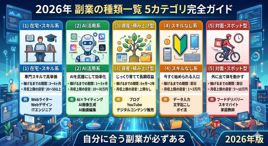2026年副業の種類一覧を5カテゴリで分けてみた